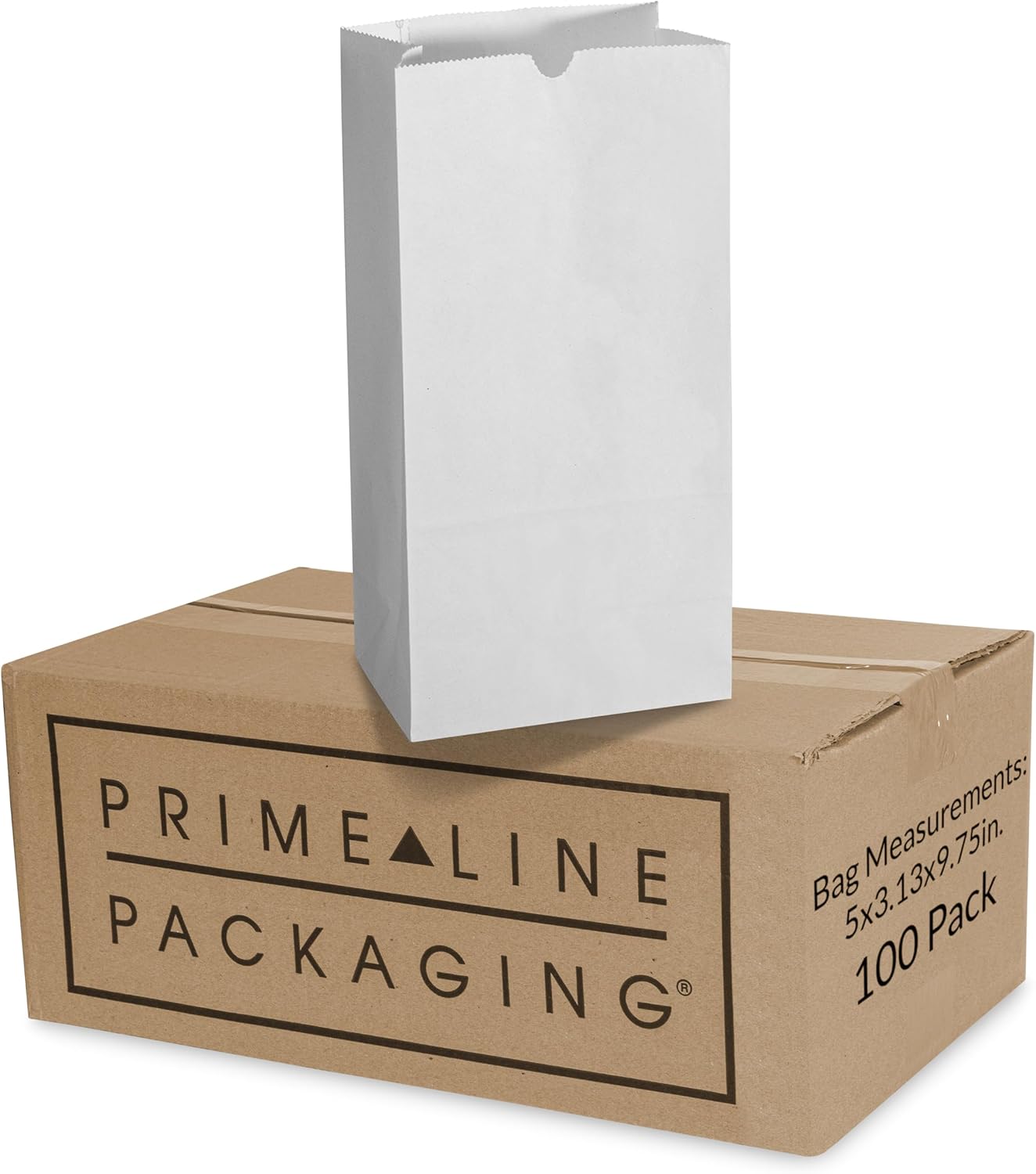 Made by Prime Line Packaging, our white kraft paper lunch bags are the perfect quality option for deli, bakery, take out, and everyday lunch use. With each bag holding a 20 LB capacity and coming in a bulk pack of 100, these large sized SOS bags measure 8.25" wide by 5.31" deep by 16.12" tall, making them the perfect size for holding sandwiches, hoagies, bread, pastries, bottles and cans, small produce, and takeout needs for delis, bakeries, restaurants, coffee shops, cafeterias, or individual use. Our kraft paper bags can also be used as party favor bags and treat bags, as well as a resourceful option for merchandise bags for items including books, magazines and more. Each bag is constructed with a squared bottom for easy standup while loading and unloading. For the creative spirit or the small business owner, these bags can be customized in a variety of ways, serving as a blank canvas to embellish with your businesses’ logo, or tailor to your own liking with stickers, markers, paints, stamps and more. Kraft paper sandwich bags can serve as the perfect party favor bags or disposable food service bags alike, and are a popular choice amongst delis, bakeries, restaurants, small businesses, boutiques, and individuals. Each white sack is versatile enough to rise to the occasion for many needs, from disposable lunch bags to food service industry bags to party favor, small customer purchase, and take-out order bags. Regardless of your needs, the design of these bags and their durable 20 LB capacity brings a variety of uses to a traditional staple of paper bags.