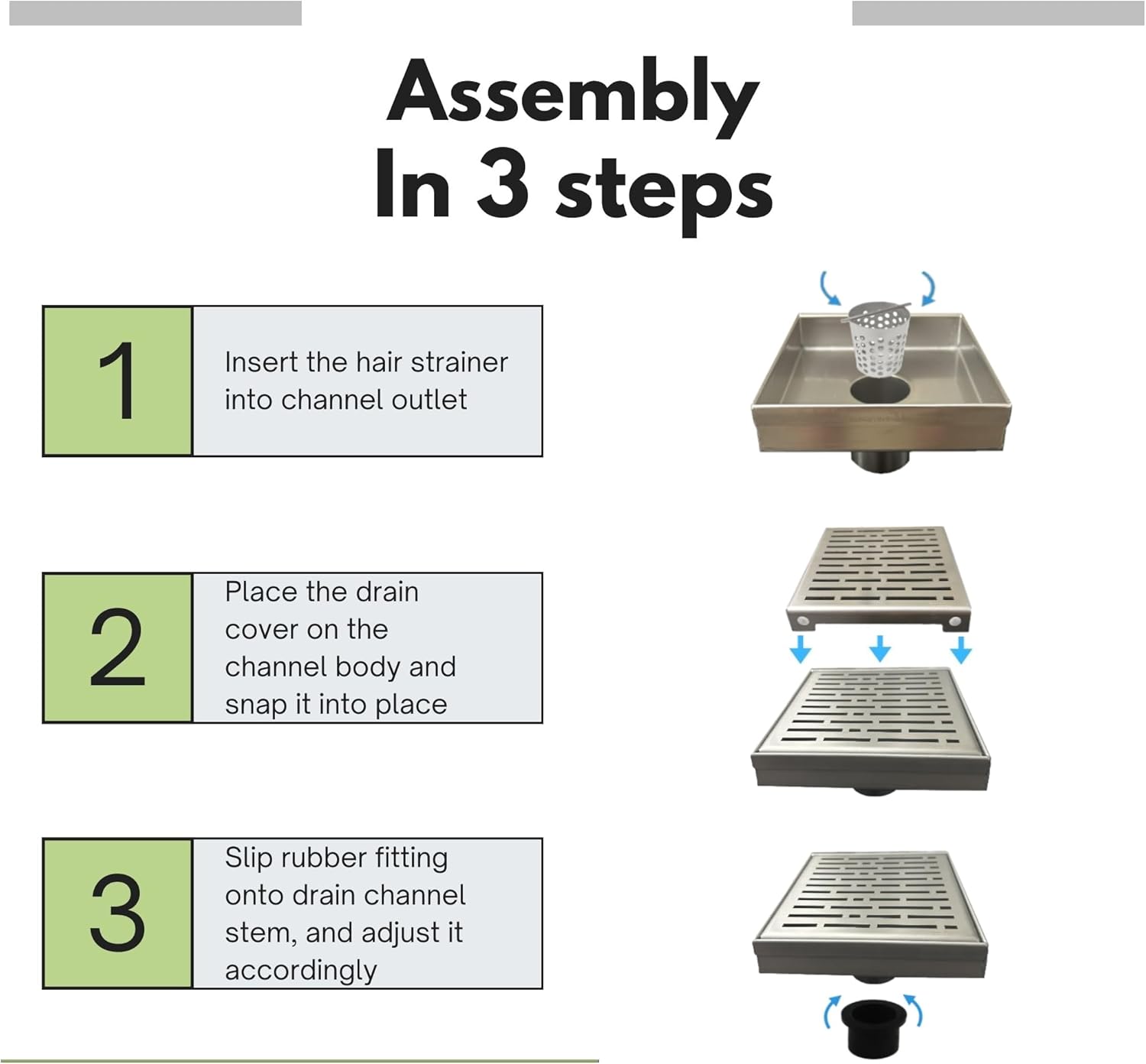 | Additional Features | Tile in Shower Drain: The SereneDrains floor drain allows you to use the same tile as your bathroom floor. |